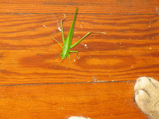 Last night around nine thirty, Hodag began acting strangely. He began making a lot of plaintive Hodag noises (which had to mean something since he is normally not a meower) and running up and down the hallway. When Colin went to investigate he reported that the cat had caught a grasshopper and was chasing it around the hallway and stairwell. Hodag had apparently been trying to let us know that he had caught a bug for us. He played with the grasshopper for an hour or so before it died.